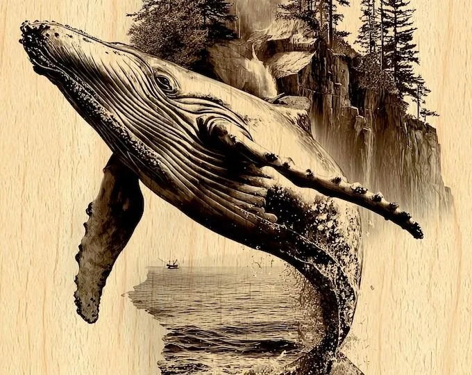 Few things in nature command as much awe as a humpback whale. This stunning engraving captures the creature's majesty in rich, warm wood — a piece that brings the deep ocean into your home with quiet power.