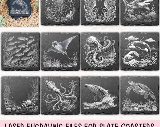 Elevate your coffee table with a set of handcrafted engraved coasters featuring your choice of ocean creatures — from crabs and starfish to octopus and seahorses. Each 4x4 coaster is deeply engraved into premium slate or wood for rich detail that lasts a lifetime.