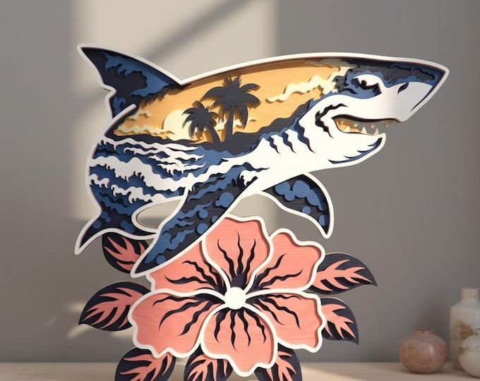 A shark silhouetted against a layered tropical sunset — bold, dramatic, and unlike anything you'll find in a big box store. This 3D layered wood piece brings the energy of the open ocean into any room with rich depth and color contrast.